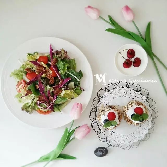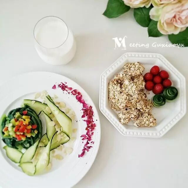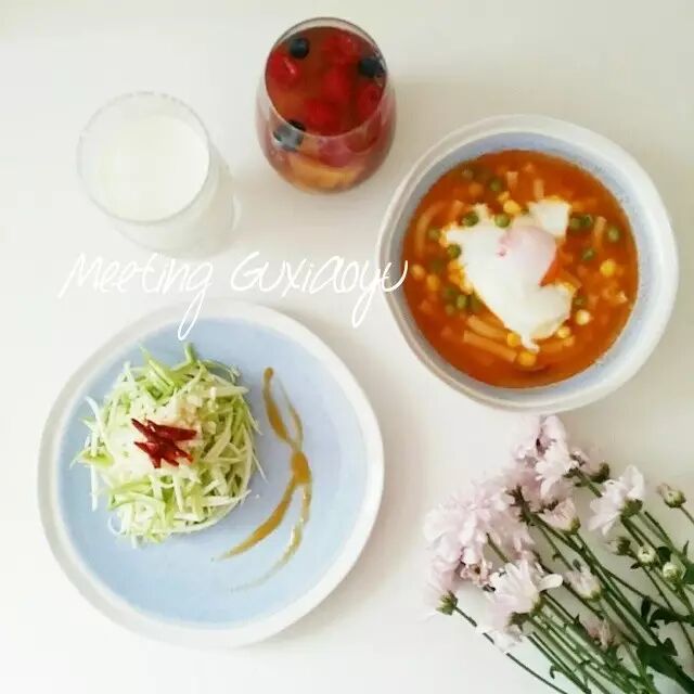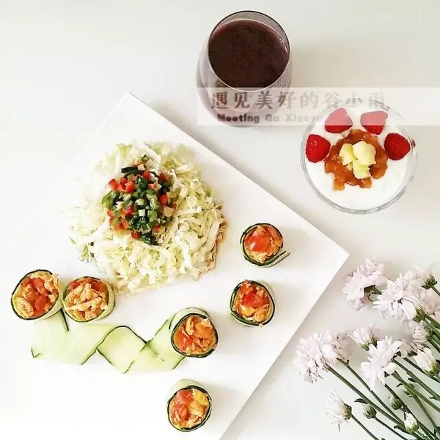 番茄炒蛋黄瓜卷+炝拌白菜心+黑米米糊+树莓杏子酱酸奶