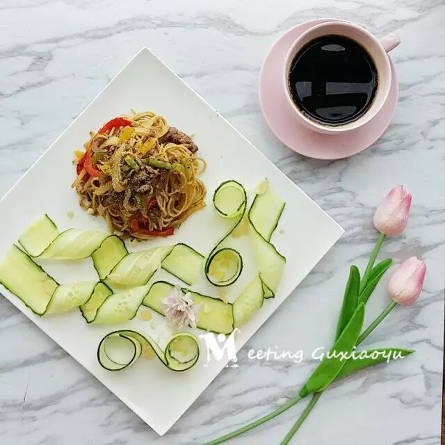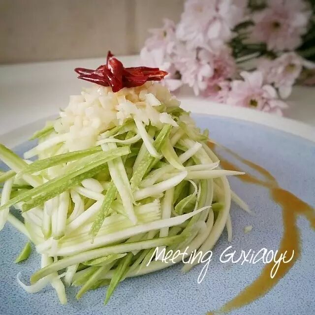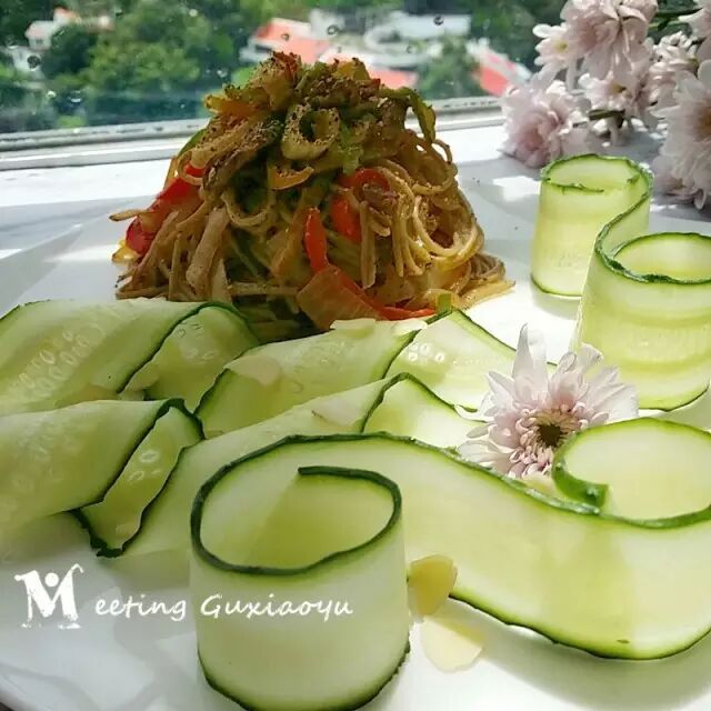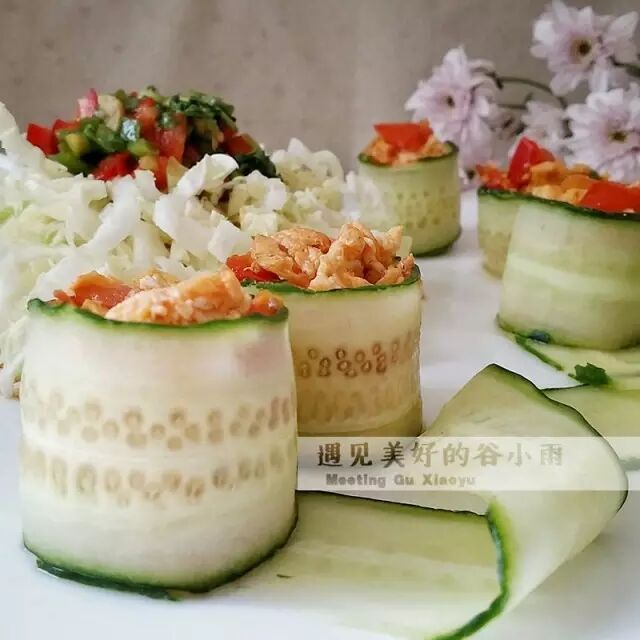 黄瓜用刮皮刀刮成一片片的,卷起来,随意造型。