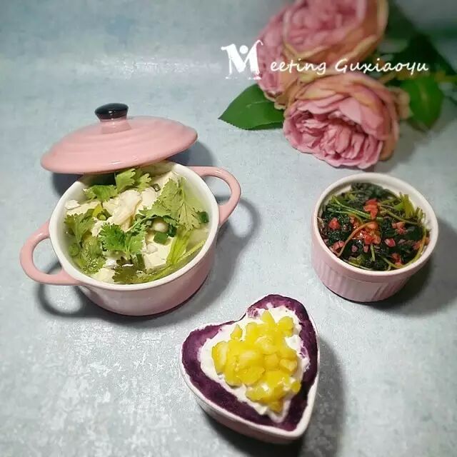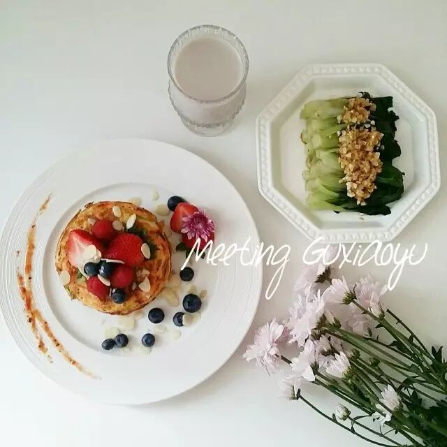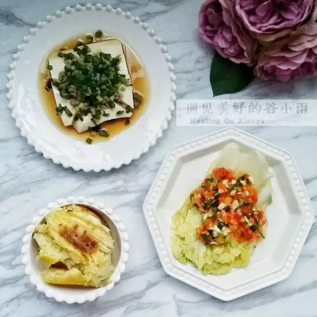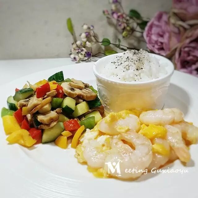 蛋白质:虾仁豆腐蒸蛋 (虾仁50g+鸡蛋50g+豆腐50g)(男可以比女生增加鸡蛋50g或虾仁50g+豆腐100g)