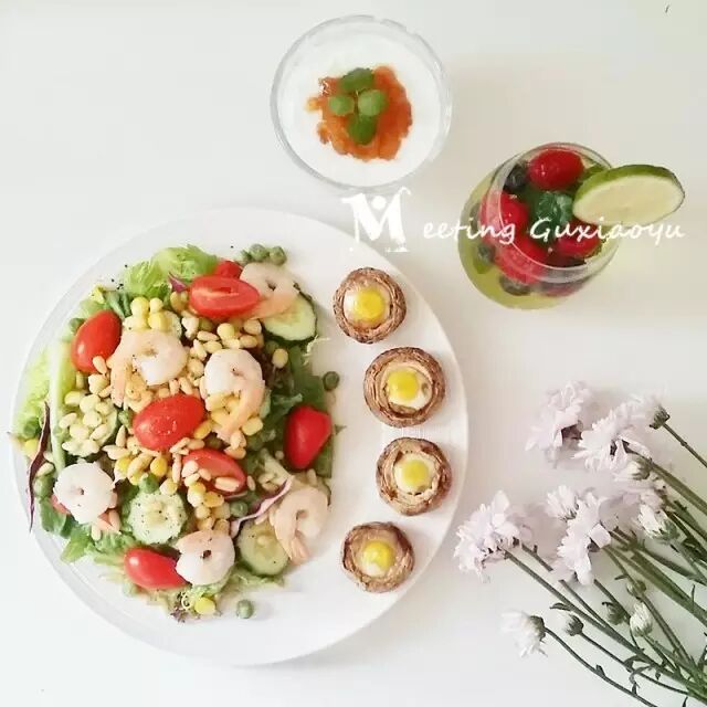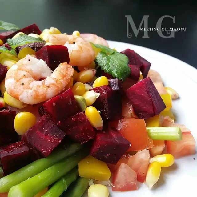 甜菜根虾仁玉米杂蔬沙拉+柠檬水