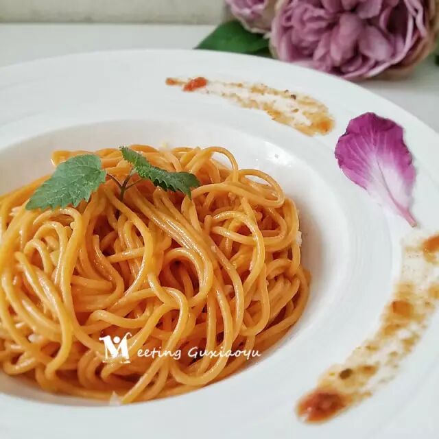 橄榄油爆香蒜蓉,放入煮好的意面,翻炒几下。