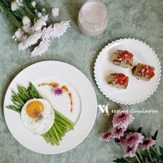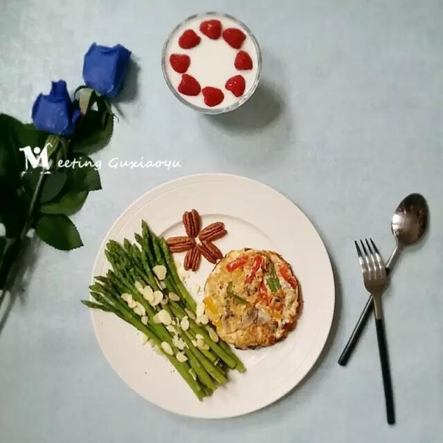 水煮芦笋+鸡蛋蘑菇燕麦饼+坚果+树莓无糖酸奶