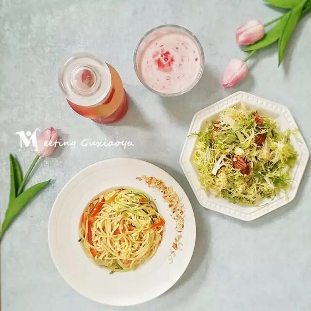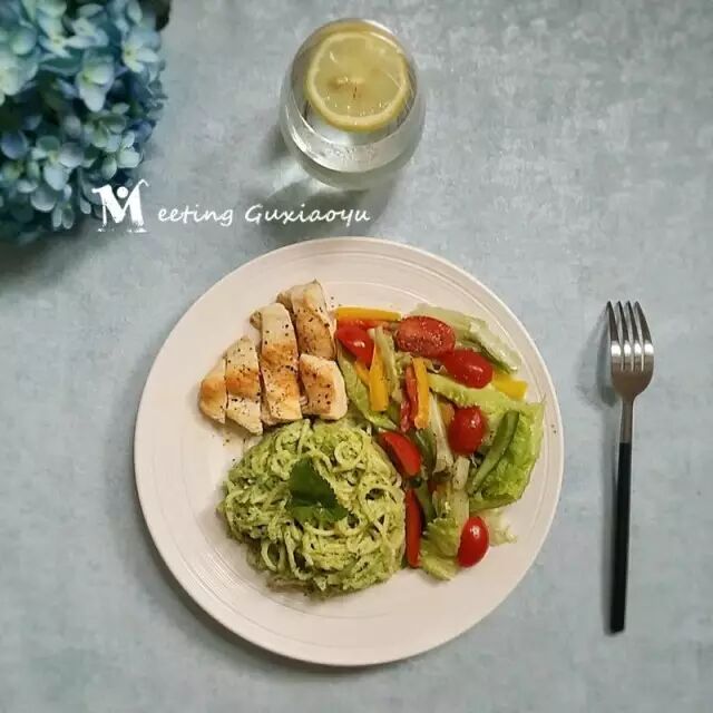 西兰花意面+香煎鸡胸+生菜沙拉+柠檬水