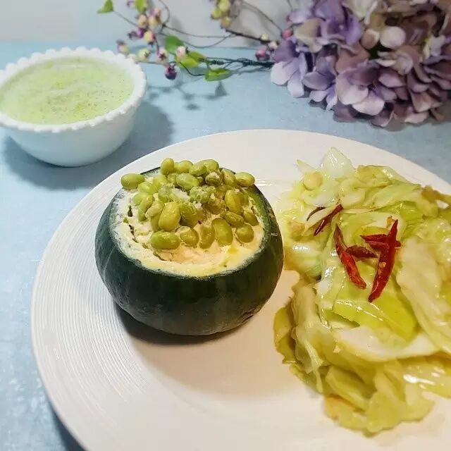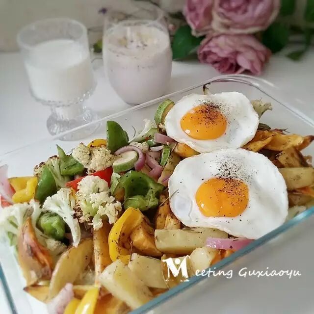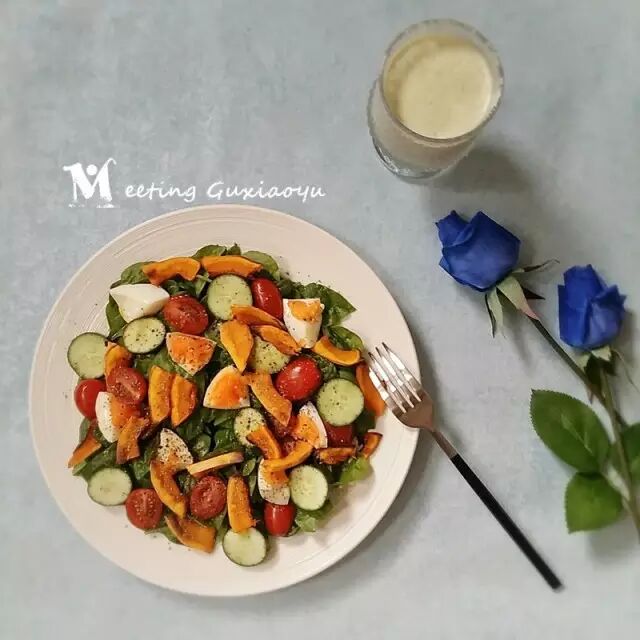 杂蔬烤南瓜鸡蛋沙拉+牛油果奶昔