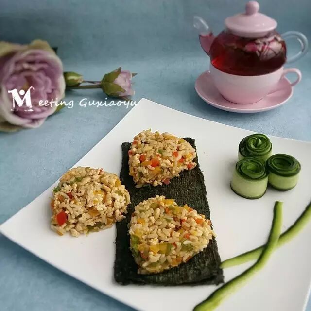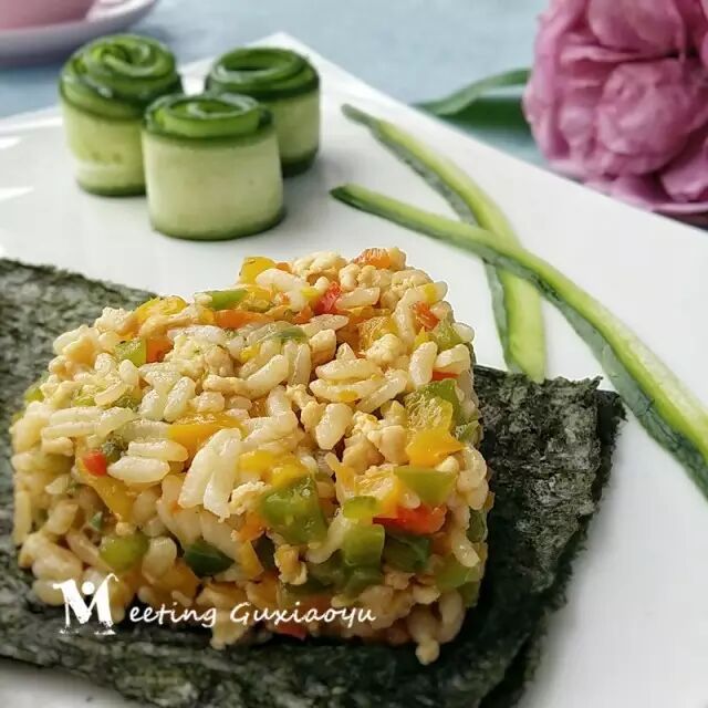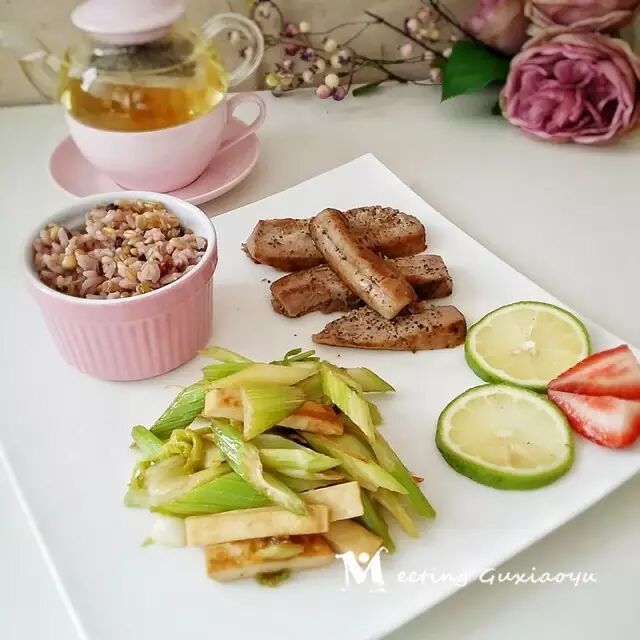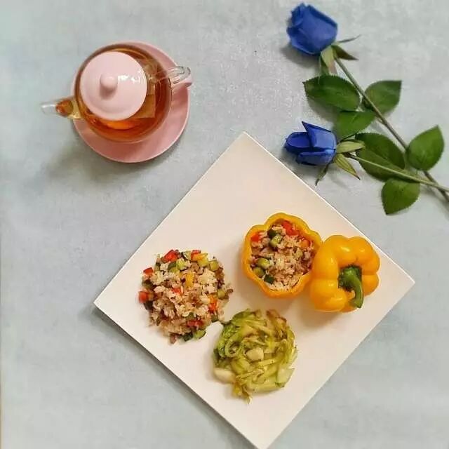 烤彩椒牛肉杂蔬丁炒饭+炝炒西芹+甘菊茶