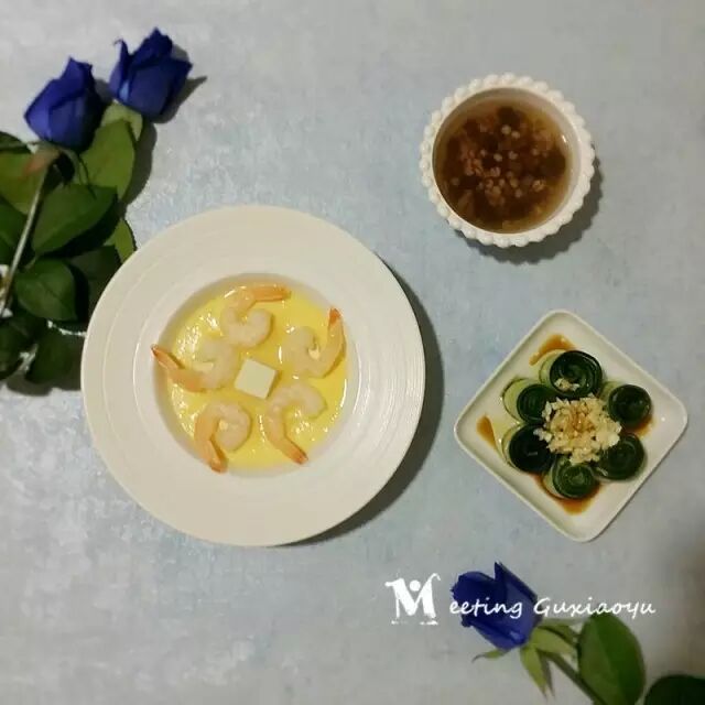 虾仁豆腐蒸蛋+炝拌黄瓜卷+红豆薏米粥