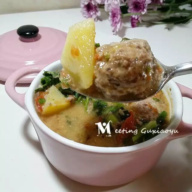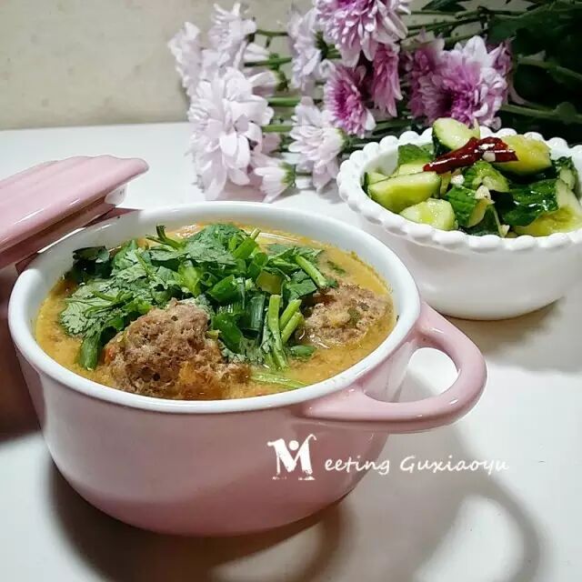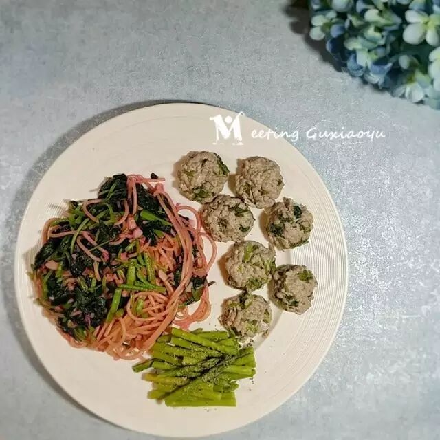 牛肉香菜丸子+蒜蓉红苋菜意面+水煮芦笋