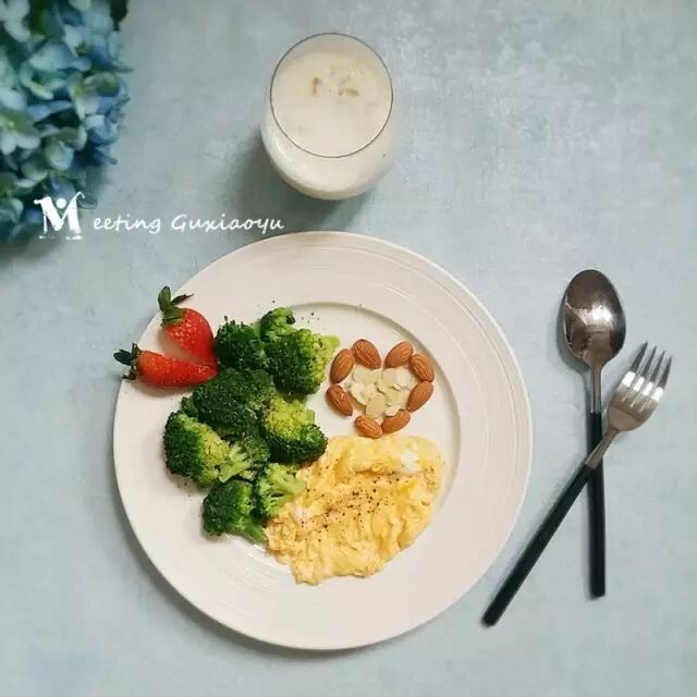 水煮西兰花+美式炒蛋+杏仁+牛奶麦片