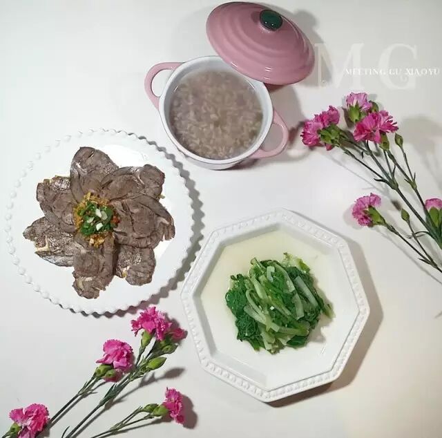酱牛肉+蒜蓉杭白菜+十谷米粥