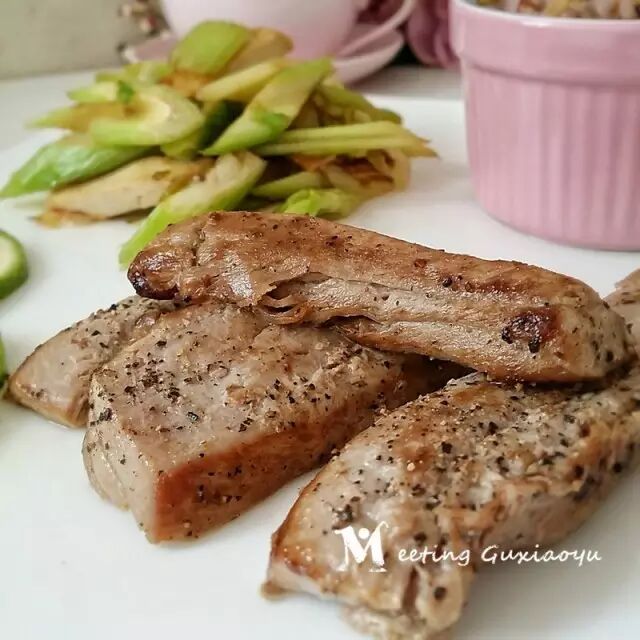 3. 煎一小会儿就翻面,洒盐和黑胡椒,再翻面,撒另一面。反复翻几回,表面微微焦黄就好了,时间不宜过长,否则会柴。