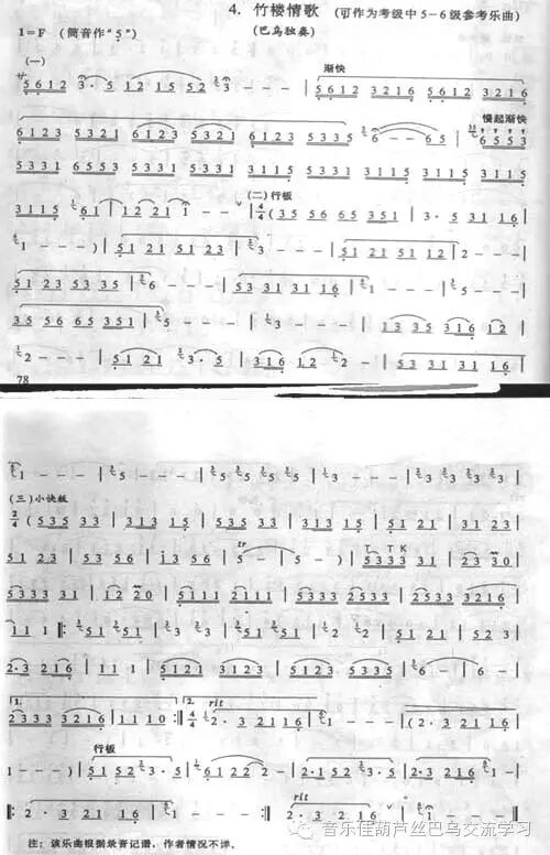 《竹楼情歌》创作背景 李海鹰1954年生于广州。他从小喜欢音乐,很早就开始显露音乐才华。1970年,他才16岁就进入广州粤剧团,当上了小提琴手兼创作员。5年以后,他成为中国海军南海舰队文工团的小提琴手兼创作员。这期间,他被送到广州星海音乐学院作曲进修班学习了一年半。1982 年底到1997年3月,他在广东音乐曲艺团当创作员,《弯弯的月亮》就是这期间写出来的。从1997年4月起,他担任了广东电视台的音乐总监 《竹楼情歌》是一首广为流传的葫芦丝、巴乌独奏曲。 创作背景:云南省的少数民族大多集中分部在云南西部和南部的山地高原地区,这里虽然海拔较高、地形崎岖,但气候湿热。如云南省南部的西双版纳傣族自治州就是属于热带季风气候,再加上云南省拥有竹林广阔的竹林。竹楼便成了傣族人民最主要的也是最具有民族特色的民居形式。傣家竹楼由竹子做成,竹子之间排列有缝隙,可以通风散热。竹楼的屋顶坡度很大,有利于排水。为了防潮,傣家竹楼的底部一般离地面2米左右,下面用几根坚固的竹子支撑起来,可以圈养牲畜。傣家竹楼多隐在浓密的绿荫之中,与周围的自然环境组成一副优美淡雅的图画。以其别具情趣的建筑式样和风格,把风景艳丽的西双版纳和瑞丽江两岸点缀得更加迷人。那些高大挺拔的椰子树、枝叶茂密的袖子树和果实累累的芒果树以及那摇曳多姿的凤尾竹,把一幢幢竹楼掩映在茂林修竹之中,真是幽美极了。 在这么美的环境下,又有那么美丽、热情的傣族姑娘,有情的人当然要在竹楼上互诉情怀、倾吐衷言了,在幽静辽远的傣家竹楼、在平静幸福的生活中,傣族青年男女倾诉真挚动人的爱情。,平静中透露着热烈浪漫;宁静中包含着祥和质朴,于是便有了《竹楼情歌》这一葫芦丝名曲。这首乐曲以其动听的旋律、真掣的情感,使众多的葫芦丝、巴乌爱好者及演奏者为之陶醉 描写傣家的竹楼和民族风情,其动听的旋律、真挚的情感,令人神往,为之陶醉。反映的是傣族青年男女在竹楼幽会的情景。 在幽静辽远的傣家竹楼、在平静幸福的生活中,傣族青年男女倾诉真挚动人的爱情。其情,平静中透露着热烈浪漫;其景,宁静中包含着祥和质朴。所谓“诗无达诂”,还是自己去慢慢品位,每人的体会都会不一样的。 全曲分为引子、主题、快板、尾声几部分。 “引子”部分:在轻柔的背景音乐中,葫芦丝以自由的散板乐句,描绘出一幅清新、美丽的竹林晨景,为进入主题乐段作了极好的铺垫,引人入胜。(引子难度比较大) “主题”部分:是一段平稳却有对比、非常优美、极富傣族风味的主旋律,就像傣家青年男女在互诉衷情。 “快板”部分:在优美的主题乐句之后,全曲进入了高潮乐段,一段无比欢快、跳跃的乐句,让人似乎看到了在幽静的竹林里、在美丽的瑞丽江边,那一对对傣家青年男女欢快起舞的情景。 “尾声”部分:一段表现青年男女们狂欢舞蹈的旋律过后,乐曲进入了尾声部分,再次响起了无比悠扬、优美的旋律,最后乐句以音量渐弱却又意犹未尽的方式结尾,让人联想到那一对对青年男女渐渐远去的身影......