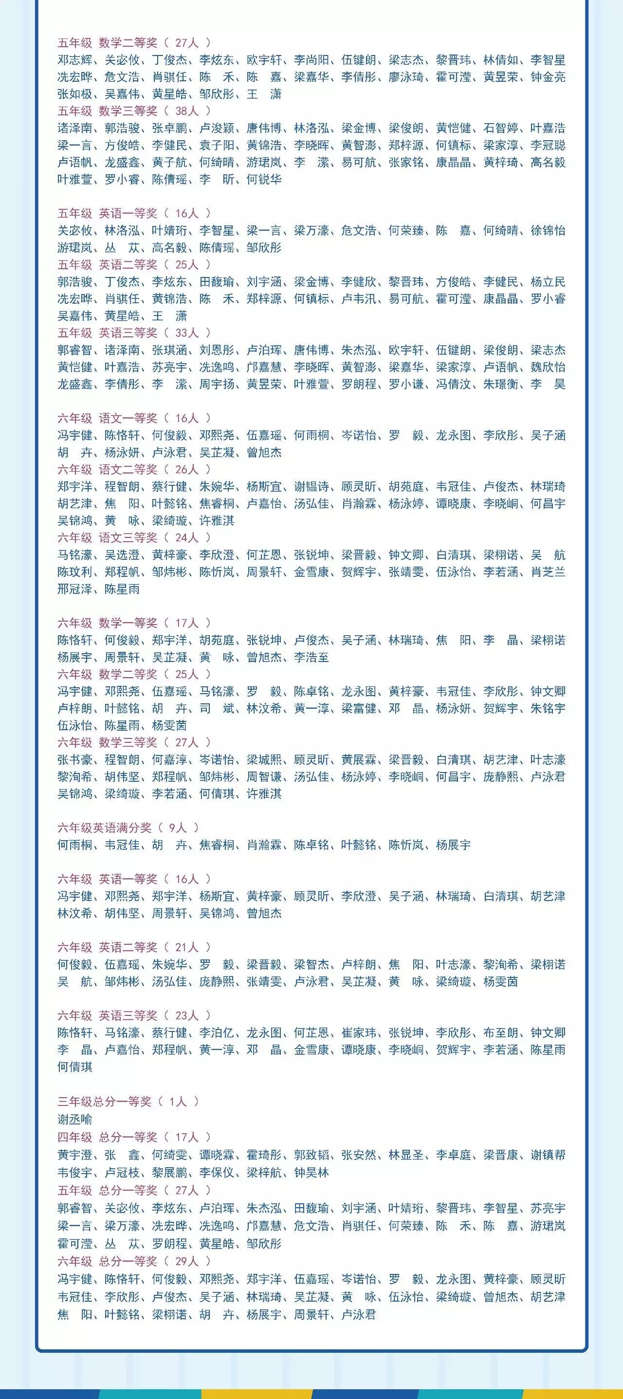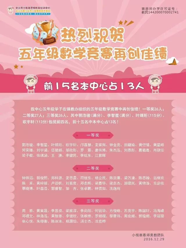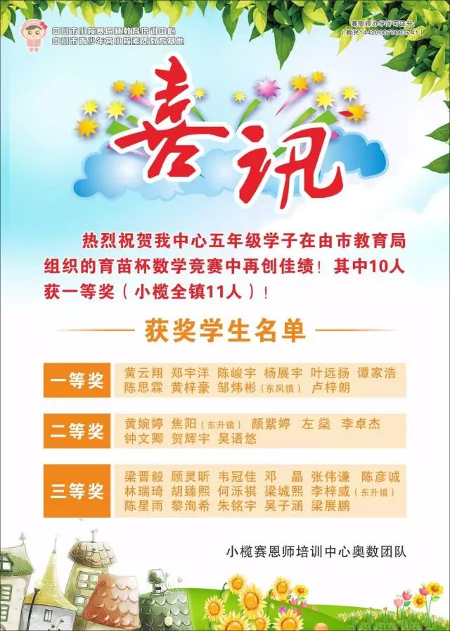 摘要:广东省小学数学“育苗杯”竞赛是由广东省小学数学专业委员会每年举办的全省性正规数学竞赛。活跃小学数学课外活动,发现和培育小学数学幼苗,培养学生的数学能力和创新意识,发散学生思维,开发学生智力。赛恩师教育小学五年级共34位同学获奖,其中10人获得一等奖(小榄全镇11人)。