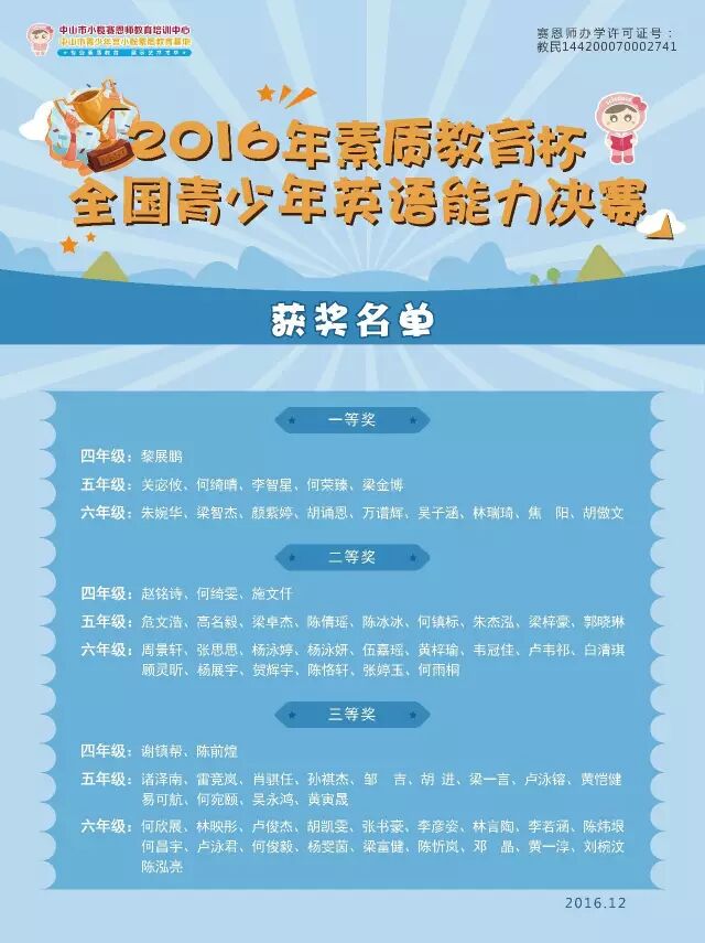 摘要:在2016年12月举行的全国青少年英语能力竞赛决赛中,本中心学员在英语老师的指导下积极参赛,取得了优异的成绩,中心共计76人获奖。向所有获奖同学及他们的指导老师表示祝贺!