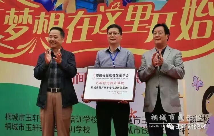 安徽省民族管弦乐学会、桐城市关工委领导为玉轩教育颁发“艺术特色教育基地——桐城市葫芦丝专业考级培训基地”牌匾