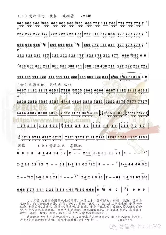 第四部分的“呼声”是种新技巧,是人在吹奏葫芦丝的同时,加上自己的喉音和声,产生2个声部的特别声响。在歌唱中这种技巧称为“呼麦”。