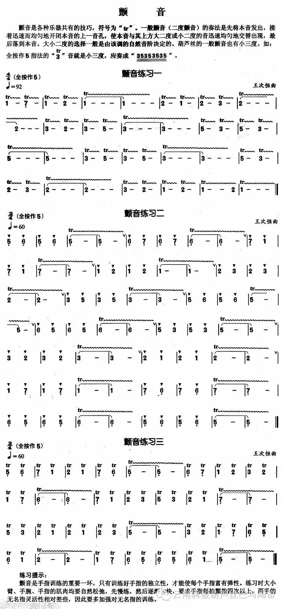 颤音练习是手指运用技巧中最重要的组成部分,它关系到手指的灵活性、独立性和持久性,还有弹力力度等。所以必须拿出足够的时间长久的练习。练习时手指要按严音孔,不要出现漏气现象,手指要保持松弛状态,要让每个手指都能作到富有弹性和灵活跳动。演奏颤音时要有一定的力度,并用吐音吹奏音头。