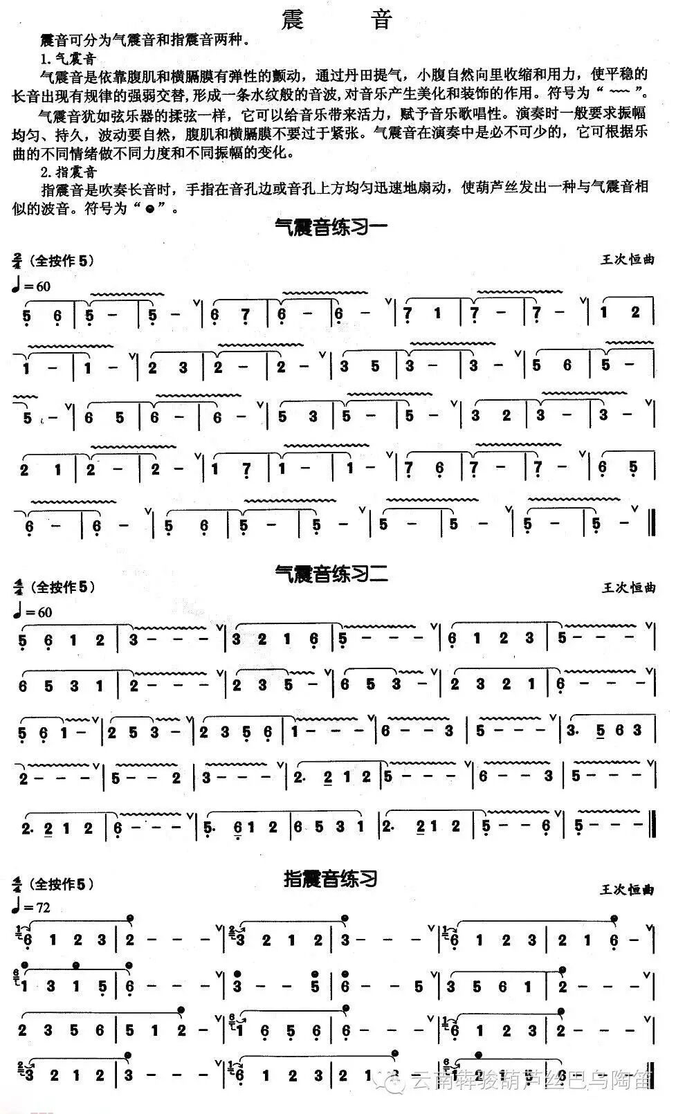 气震音,也称腹颤音,一般用符号~ ~ ~标识,它是靠气息有规律地强弱交替而形成的水纹般的音波,是依靠腹肌和横隔膜有弹性的颤动而获得的。其效果也类似弦乐揉弦,但它和指震音相比较在风格上不如指震音浓郁。气震音给人的感觉是清新,淡雅的感觉在中速,慢板的抒情曲中用的特别多,二点的共同点都是起到美化的作用。二者的有机结合可使葫芦丝、巴乌的演奏达到最佳的艺术效果,气震音的练习要经过一个漫长的过程、功夫才到位,才能做到控制自如。