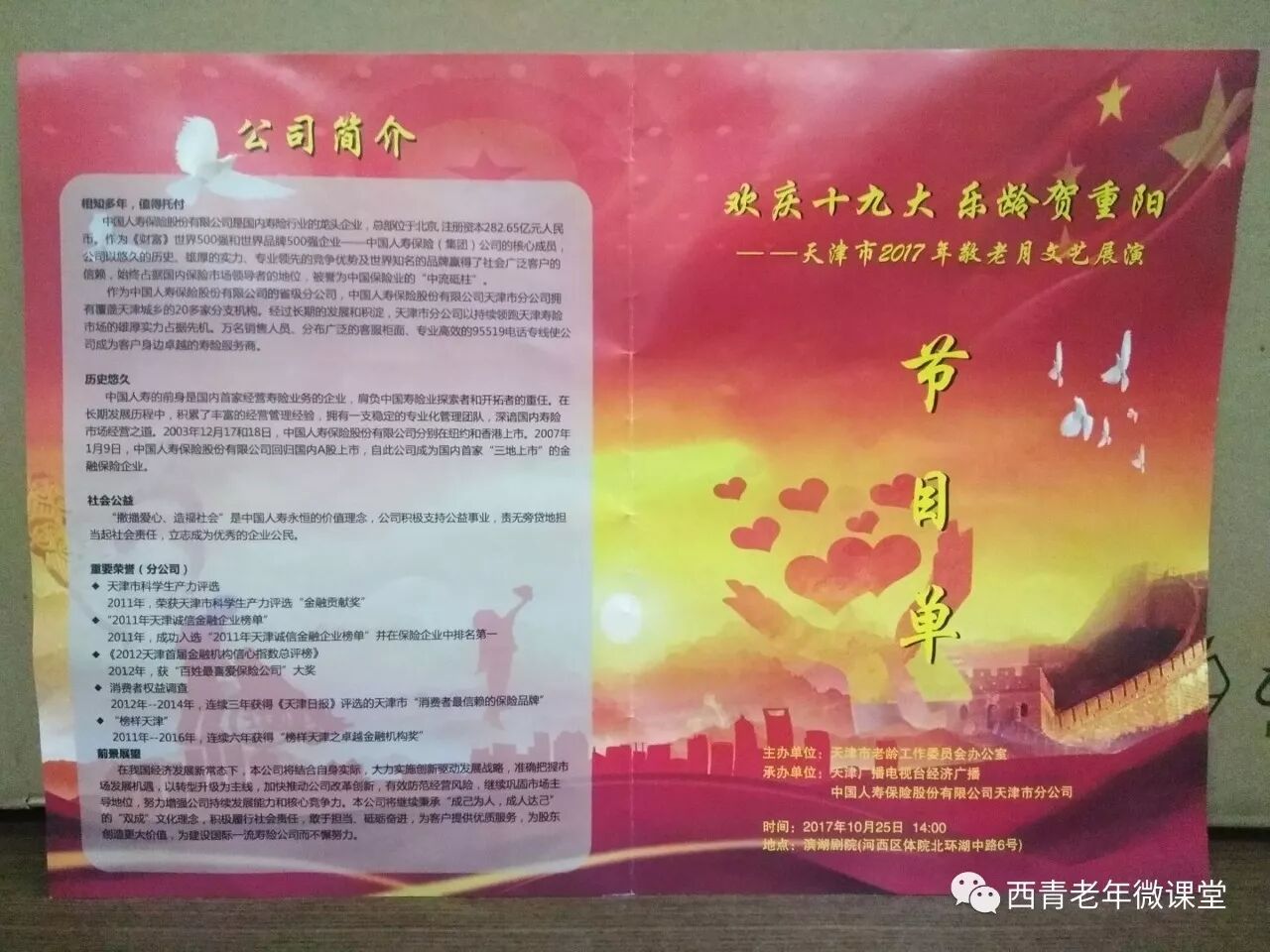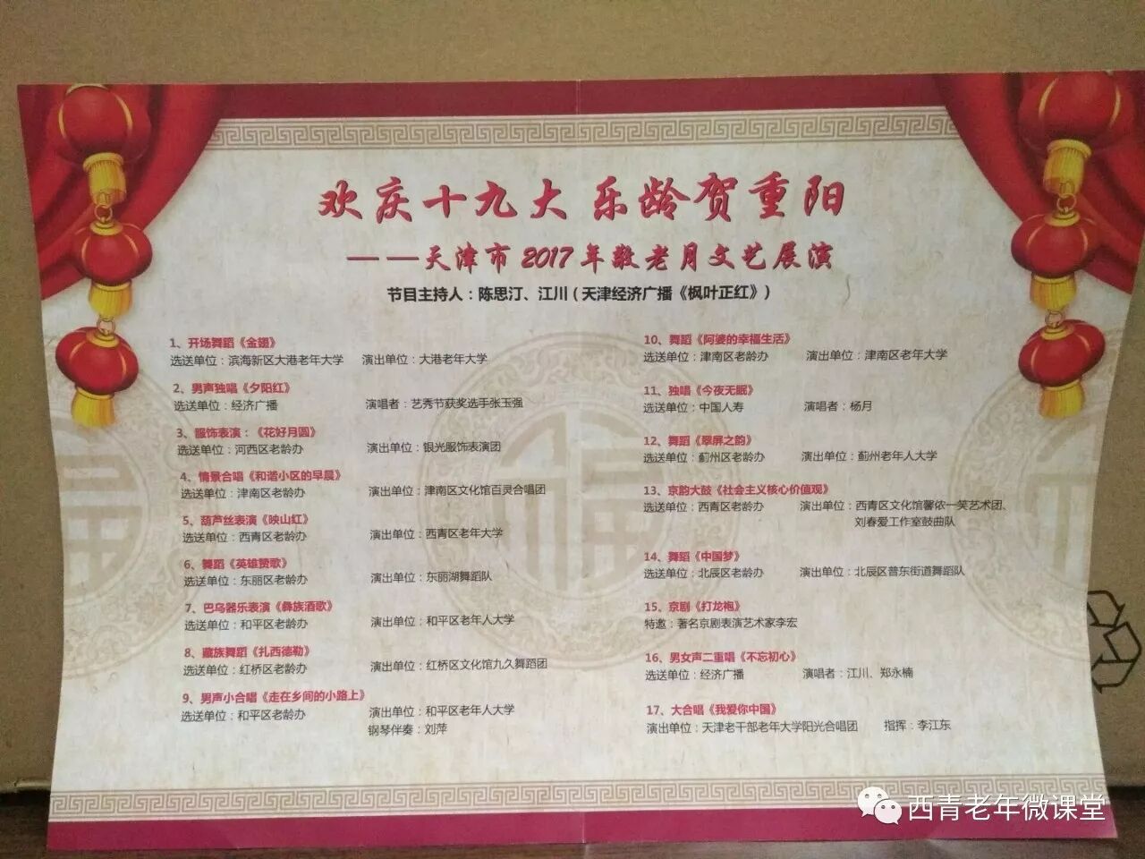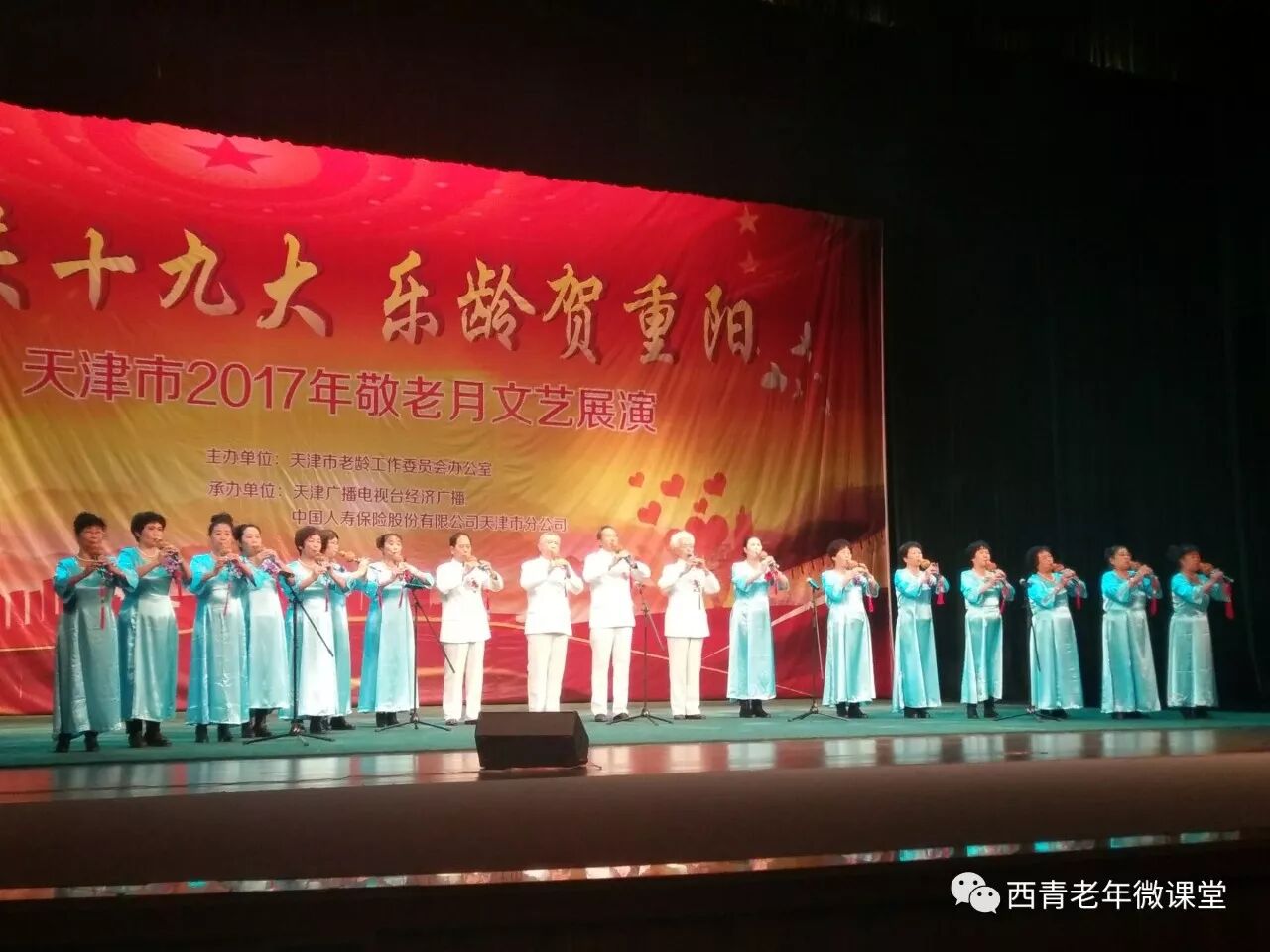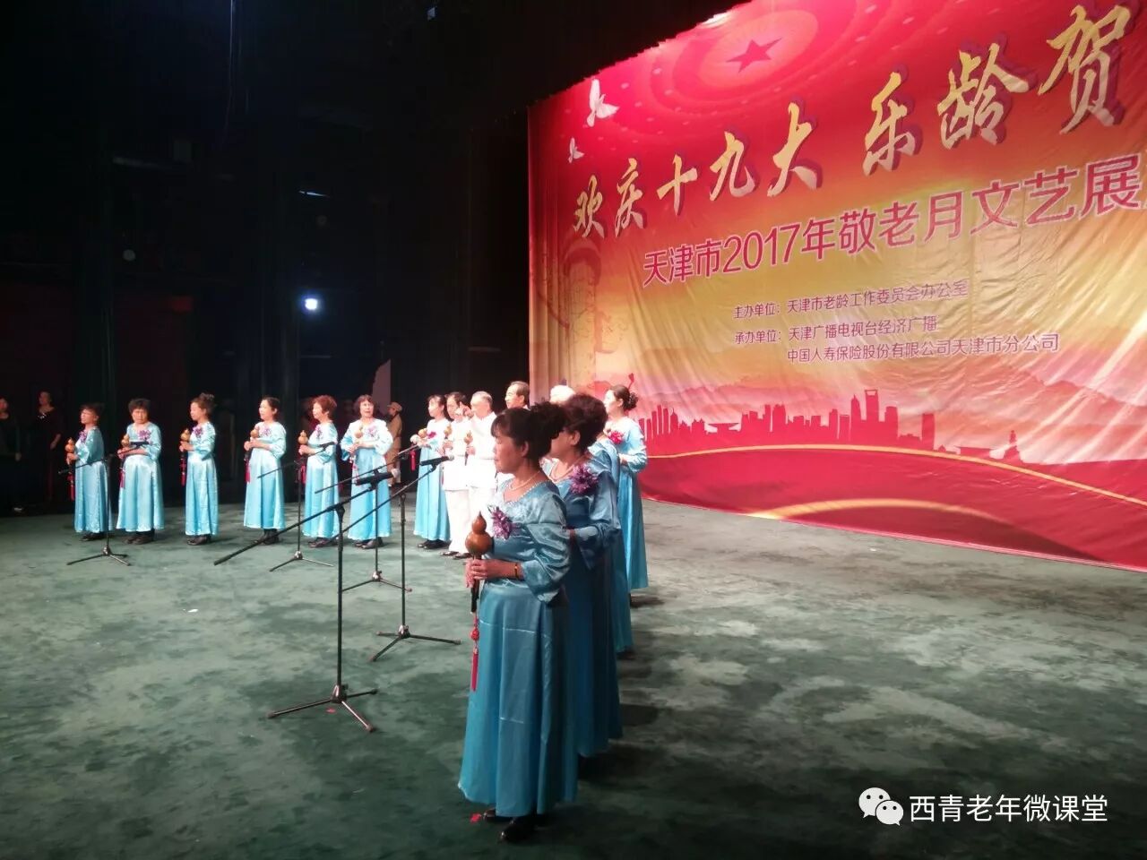 2017年10月25日,由天津市老龄委主办,天津广播电视台经济广播、中国人寿天津分公司承办的欢庆十九大,乐龄贺重阳——天津市2017年敬老月文艺展演在滨湖剧院隆重召开,西青老年大学葫芦丝学员演奏的《映山红》排在第五位出场,赢得现场观众阵阵掌声。