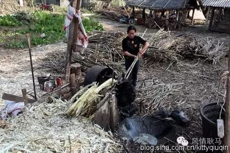 每年一月初是甘蔗收获的季节,最好的收割时间只有20天,此前甘蔗尚未熟透不够甜度,而过了此时甘蔗就开花了,空心失去了水分,所以每逢榨季,坝子一片忙碌。虽然80公里外的耿马城到处是浓烟滚滚的现代化糖厂,但在讲究吃糯米甜食、对糖的甜香要求很高的孟定,人们还是更欢迎土制的红糖。在派卡乡的下坝村,我见识了传统手工作坊里的榨糖工艺。