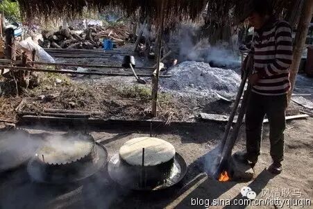这是个阳光通透的下午。进了凤尾竹掩映的寨门,远远就闻到一股蔗糖的甜香。一片竹棚旁堆着小山一样的竹蔗,这种甘蔗傣语叫“苇楞”,汉语叫黄蔗和罗汉蔗,是孟定本地种植历史久远的传统蔗,出水多、糖分高、味清香又便于土法压榨。小小手扶拖拉机还在近旁的农田里源源不断地将新收割的甘蔗运过来。甘蔗堆旁是一台小马达发电的榨汁机,雪白的甘蔗汁通过一根管道接到竹棚底下的大煮锅里。竹棚的地下挖空埋了联排的锅灶,甘蔗汁咕嘟嘟在火苗旺盛的大锅里沸腾着,几口大锅一溜儿排开去,非常热烈。甘蔗汁煮透、挥发去水分后,倒到容器里,用竹篾迅速地搅拌成浆,待搅拌得起糖沙后,均匀地倒入铺在稻草上的木长条夹里,晾干,切块,装箱。这套流水线工序十分科学,但因要抢榨季确保甘蔗新鲜即榨,农家半夜两点就得起床,在这流水线上一天忙碌十几个小时,非常辛苦。这种手工片糖是远近乡民做傣家节庆“毫崩”、“毫诺索”等甜食首选的材料,要卖到5元/斤,供不应求,糖刚切出来,买家已等在一旁了。