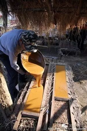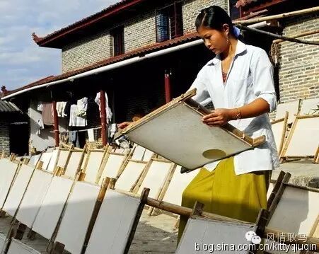 芒团寨位于孟定镇东9公里外的山脚,溪水潺潺流过小村,整洁安静,许多人家门牌旁都挂着“造纸户”的典雅牌子,院落摆放着一排排竹制的抄纸架,布帘上晾晒着雪白的纸浆。成功申报成为首批国家级非物质文化遗产后,寨子的传统手工造纸户增加到了80多户,一方面农闲时节有活干,另一方面每户每年也能凭此增加几千元的收入。