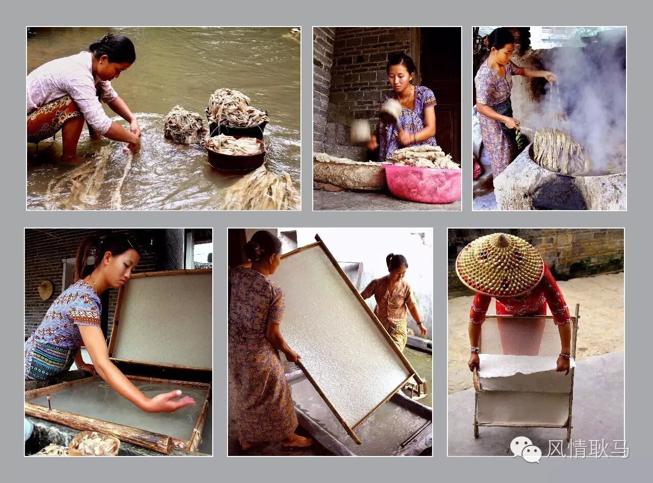芒团棉纸已有几百年的生产历史,其制造过程除了一口铁锅外,完全以树皮、竹、木、石为材料和辅助工具,保留着我国古代四大发明中1800年多前东汉蔡伦发明的造纸术的完整工序,堪称中国古代造纸的活化石。造纸原料为“构树皮”,傣家人叫“埋沙”。剥下构树皮后,要经过采料—晒料—浸泡—拌灰—蒸煮—漂洗—捣浆—浇纸—晒纸—砑光—揭纸等11道工序。在整个生产过程中,男人除了帮忙采料外,其它工序都由女人来完成。这种被称之为“洁沙”的白棉纸,纸质坚韧,久存不陈,防腐防蛀,被旧时官府用来颁布告示及公文行文,佛寺用来抄写经文,如今被银行用来捆扎钞票,骚人墨客用来写字作画,民间用来剪纸刺绣、裱龙糊凤,茶叶公司用来包装普洱茶等。