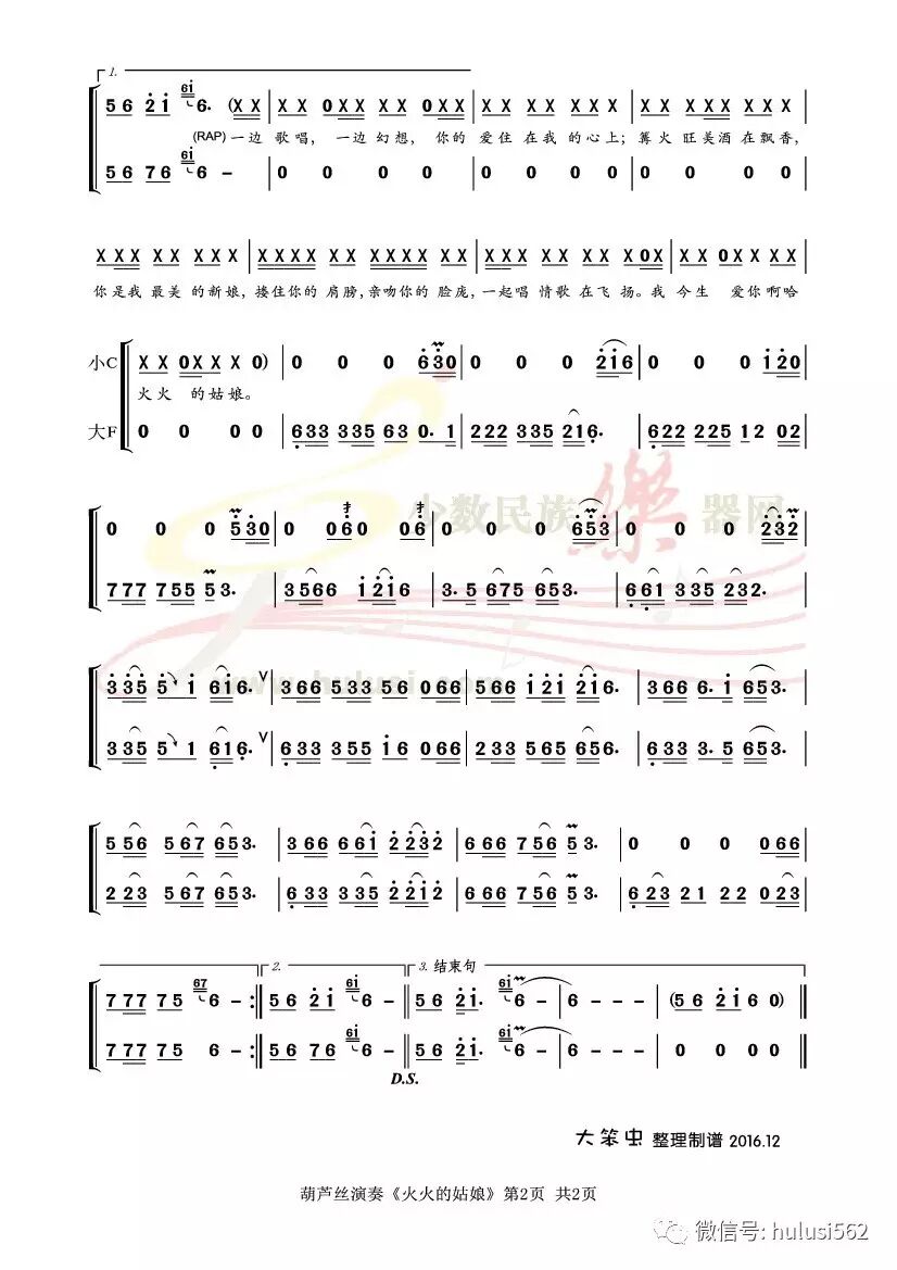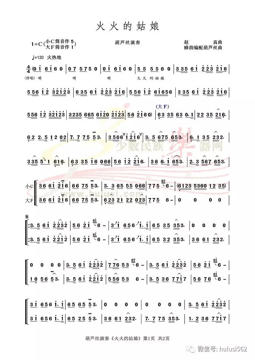 根据这首草原流行金曲改编的葫芦丝重奏曲,由大F调(筒音作1)与小C调(筒音作5)联合演奏;为表现乐曲欢快热烈的激情气氛,我们较多地采用了快速的叠音和波音技巧;同时在表现优美情深方面,上下滑音、收气休止以及前倚音、切分音的运用上,也彰显出葫芦丝演奏草原流行曲的独特魅力。